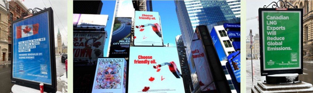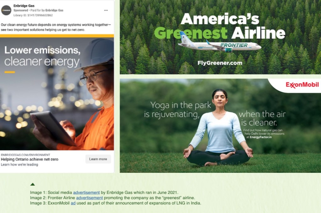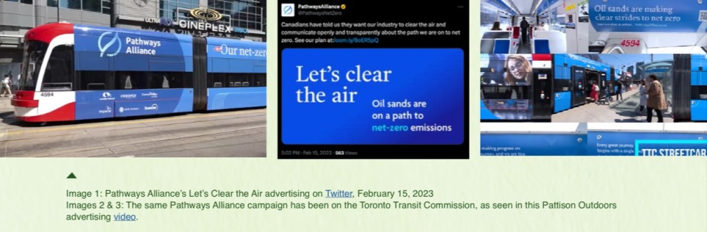 ในปี 2022 กลุ่ม Pathways Alliance (พันธมิตรของผู้ผลิตน้ำมันจากทรายน้ำมันรายใหญ่ที่สุด 6 แห่งในแคนาดา) ได้เปิดตัวแคมเปญโฆษณาชื่อ “Let’s Clear the Air” แคมเปญนี้โปรโมท “เส้นทางสู่การเป็นกลางทางคาร์บอน” ของพวกเขา และออกอากาศระหว่างการแข่งขัน FIFA World Cup 2022 และ Super Bowl 2023 รวมถึงโฆษณาบนรถบัสทั่วประเทศ อย่างไรก็ตาม ปัญหาคือกลุ่มพันธมิตรนี้พึ่งพาเทคโนโลยีการดักจับและกักเก็บคาร์บอน (CCS) ที่ “ยังไม่ได้รับการพิสูจน์อย่างกว้างขวาง” เพื่อจัดการกับน้ำมันหลายล้านบาร์เรลที่ผลิตทุกวันในทรายน้ำมัน ซึ่งในปี 2021 มีปริมาณถึง 2.84 ล้านบาร์เรลต่อวัน