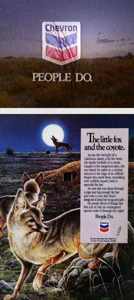 ในช่วงปี 1980 แคมเปญโฆษณา “People Do” ของ Chevron ใช้กลยุทธ์หลายอย่างในการดึงดูดกลุ่มผู้ชมที่มีจิตสำนึกทางสังคม ซึ่งอาจมีท่าที “ไม่ชอบ” บริษัท ในฐานะส่วนหนึ่งของแคมเปญ บริษัทโปรโมทโครงการสิ่งแวดล้อมจำนวนหนึ่งซึ่งกฎหมายกำหนดให้ต้องทำ เช่น การปกป้องหมีกริซลี่ในมอนแทนาและสุนัขจิ้งจอกคิทในแคลิฟอร์เนีย นักวิจารณ์โต้แย้งว่าโฆษณาเหล่านี้สนับสนุนการยกเลิกกฎระเบียบ เนื่องจากสร้างความเข้าใจว่าบริษัทสามารถจัดการทุกอย่างได้เอง ทั้งที่จริงๆ แล้วการกระทำของพวกเขาเป็นไปตามกฎหมายที่บังคับ