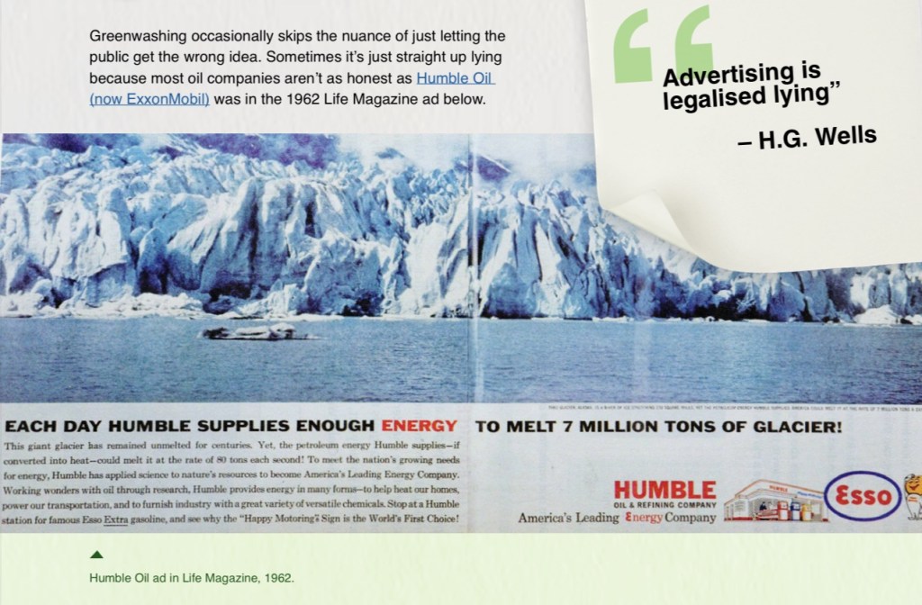 การฟอกเขียวบางครั้งไม่ได้ใช้เพียงการทำให้สาธารณชนเข้าใจผิด แต่เป็นการโกหกโดยตรง เพราะบริษัทน้ำมันส่วนใหญ่ไม่ได้ซื่อตรงเหมือน Humble Oil (ปัจจุบันคือ ExxonMobil) ในโฆษณานิตยสาร Life ปี 1962 ด้านบนนี้
