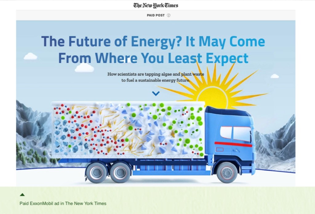 ในปี 2011 สหราชอาณาจักรได้สั่งห้ามโฆษณาของ ExxonMobil ที่โปรโมตเชื้อเพลิงชีวภาพจากสาหร่ายซึ่งยังอยู่ในขั้นทดลอง เนื่องจากกล่าวเกินจริงถึงผลกระทบต่อสิ่งแวดล้อม Exxon อ้างว่าเทคโนโลยีนี้ช่วยลดการปล่อยก๊าซเรือนกระจก ทั้งที่ CEO Rex Tillerson ยอมรับว่ามันอาจต้องใช้เวลามากกว่า 25 ปีกว่าจะผลิตเชื้อเพลิงที่ใช้งานได้จริง ทศวรรษต่อมา การวิจัยเกี่ยวกับสาหร่ายของ Exxon ถูกยุติในปี 2023 เนื่องจากไม่มีความคุ้มค่าในเชิงเศรษฐศาสตร์ แม้ Exxon จะโปรโมตการวิจัยสาหร่ายในการตลาดที่เป็นมิตรต่อสิ่งแวดล้อมเป็นเวลาหลายปี แต่ค่าใช้จ่ายประจำปีในด้านการสร้างภาพลักษณ์ด้านสภาพภูมิอากาศในปี 2018 ของ Exxon เกือบสองเท่าของการลงทุนประจำปีในการวิจัยเชื้อเพลิงชีวภาพในปี 2020 แท้จริงแล้วการวิจัยนี้มุ่งเน้นที่การเสริมสร้างชื่อเสียงด้านสิ่งแวดล้อมของ Exxon มากกว่าการปกป้องสภาพภูมิอากาศ ซึ่งทำให้ Bill McKibben นักสิ่งแวดล้อมกล่าวล้อเลียนว่าเป็น “scum scam” อย่างแท้จริง