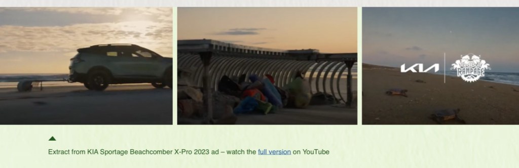 โฆษณา “Beachcomber” ปี 2022 ของ Kia สำหรับรถ Kia Sportage X-Pro SUV (รถอเนกประสงค์) แสดงภาพคนขับ SUV บนชายหาดและใช้รถในการเก็บขยะเพื่อให้เต่าทะเลสามารถคลานจากทะเลไปยังที่ทำรังที่สะอาดบนผืนทรายได้ โฆษณากล่าวว่า “ทำสิ่งดีๆ มากขึ้น” ทั้งๆ ที่ความจริงแล้วรถขนาดใหญ่ที่กินน้ำมันอย่าง SUV มีส่วนในการทำให้โลกร้อน ซึ่งกำลังเป็นอันตรายต่อประชากรเต่าทะเล ทำไม? เพราะไข่เต่าทะเลจะฟักเป็นตัวผู้ในอุณหภูมิเย็นและเป็นตัวเมียในอุณหภูมิที่ร้อนขึ้น เมื่ออุณหภูมิของโลกเพิ่มสูงขึ้น เต่าทะเลจึงฟักออกมาเป็นตัวเมียมากขึ้นเรื่อยๆ — ในบางพื้นที่ 99% ของลูกเต่าเป็นเพศเมีย