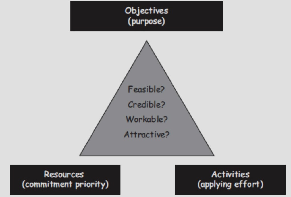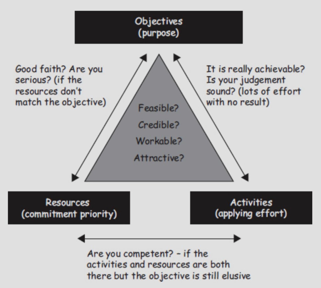 เป้าหมาย ทรัพยากร และกิจกรรม — สิ่งเหล่านี้ต้องเป็น “สามเหลี่ยมที่ลงตัว” เพื่อให้แคมเปญดูเป็นไปได้ หากทั้งสามสอดคล้องกัน แคมเปญจะดูน่าสนใจ เป็นไปได้ และน่าเชื่อถือ แต่ถ้าไม่ แคมเปญจะถูกปฏิเสธ ไม่ว่าจะเป็นเรื่องที่ดีแค่ไหนก็ตาม