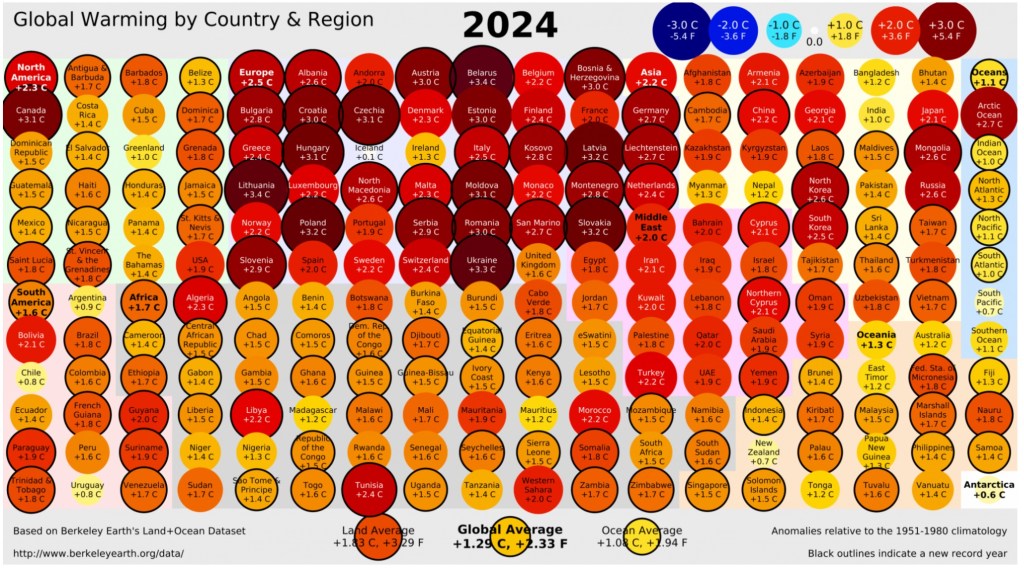 แผนภูมิต่อไปนี้จะแสดงสรุประดับความร้อนที่ประเทศ/ภูมิภาคต่างๆ ประสบในปี 2024 เทียบกับค่าเฉลี่ยปี 1951–1980 โดยประเทศที่ทำสถิติสูงสุดใหม่จะถูกล้อมกรอบด้วยเส้นสีดำ