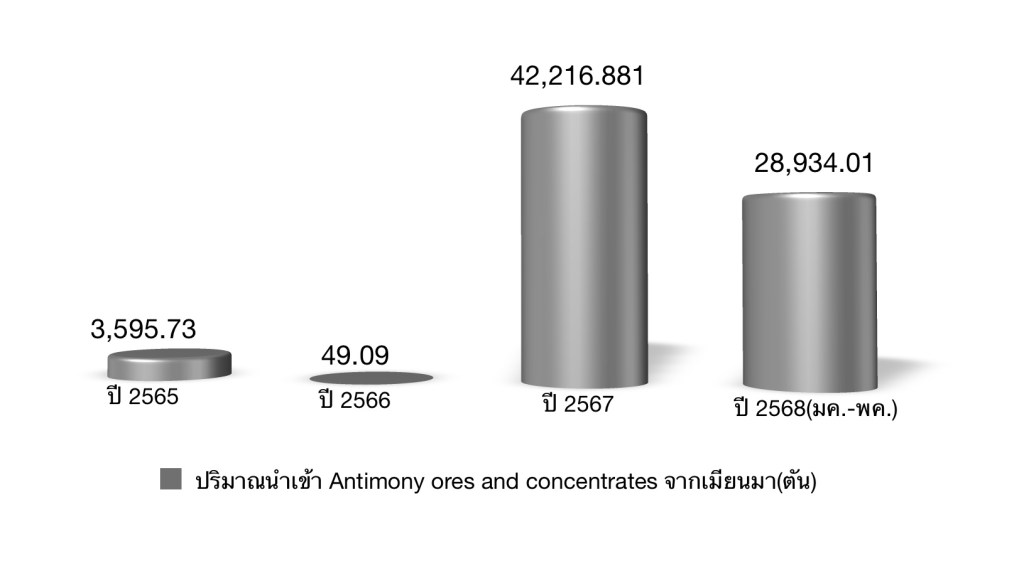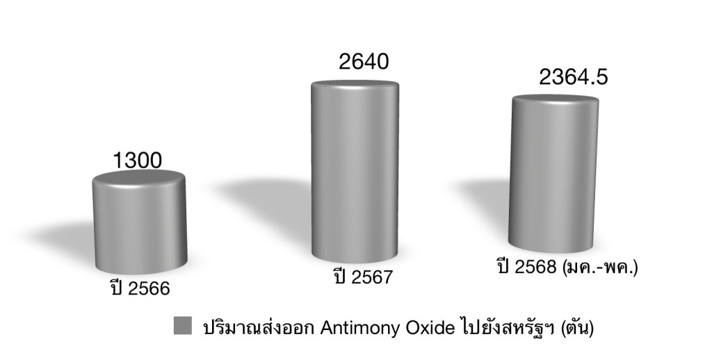 จากข้อมูลพิกัดอัตราศุลกากร(HS-code 28258000) ปริมาณส่งออก Antimony oxides จากไทยไปยังสหรัฐฯ ในปี พ.ศ.2567 เพิ่มขึ้นเป็น 2 เท่าเทียบกับปี พ.ศ.2566 และจนถึงเดืิอนพฤษภาคม 2568 ปริมาณส่งออก Antimony oxides จากไทยไปยังสหรัฐฯ ปริมาณ 2,364.5 ตัน หรือเกือบเท่ากับปริมาณส่งออกในปี พ.ศ.2567 ทั้งปี