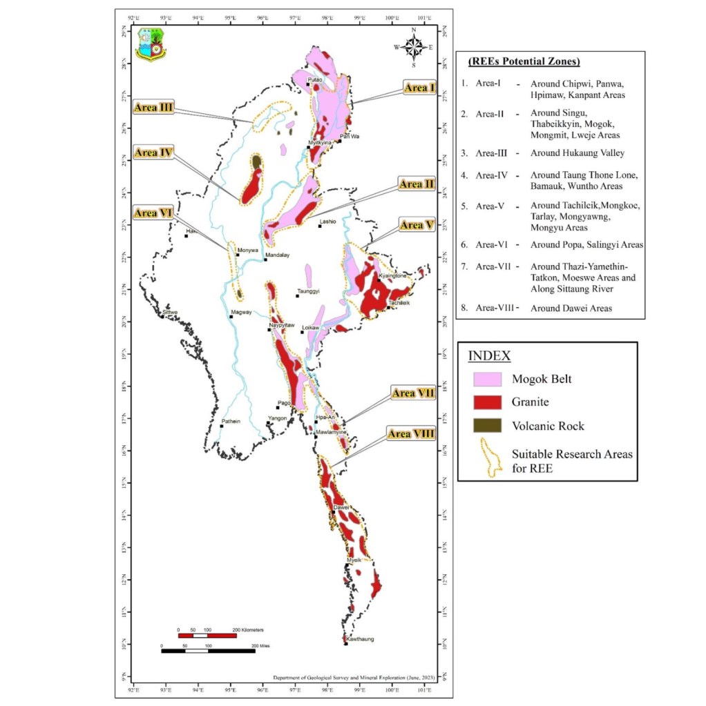 - ร่าง manuscript ชื่อ Some critical mineral and element occurrences and potential in Myanmar ซึ่งเสนอโดย Department of Geological Survey and Minerals Exploration Ministry of Natural Resources and Environmental Conservation, Naypyitaw, Myanmar และตีพิมพ์ลงใน Thai Geoscience Journal เดือนกรกฎาคม พ.ศ.2565 ระบุชัดเจนว่า “เมียนมามุ่งเน้นการสำรวจแร่ที่มีความสำคัญมาก(critical Minerals) ในกรณีของแร่หายาก(REEs) มีพื้นที่ที่มีความเหมาะสมในการศึกษาวิจัยมี 8 พื้นที่ หนึ่งในนั้นคือรัฐฉานที่ด้านตะวันออกจรดแม่น้ำโขง และด้านตะวันตกจรดแม่น้ำสาละวิน ด้านเหนือจรดพรมแดนจีนและด้านใต้จรดพรมแดนไทย(เชียงราย/เชียงใหม่) หากแนวทางกล่าวนี้เป็นจริง ก็จะเป็นความท้าทายหลักของการกอบกู้ฟื้นฟูวิกฤตมลพิษข้ามพรมแดนในอนุภูมิภาคแม่น้ำโขง(กก/สาย/รวก/โขง)อย่างแท้จริง (ในเมียนมา แร่หายาก (REEs) ส่วนใหญ่พบร่วมกับหินแกรนิตที่แทรกตัวเข้าไปในแนวหินแปรโมก๊อก (Mogok Metamorphic Belt – MMB) โดยเฉพาะบริเวณทางตะวันออกและตะวันออกเฉียงเหนือของประเทศ)
