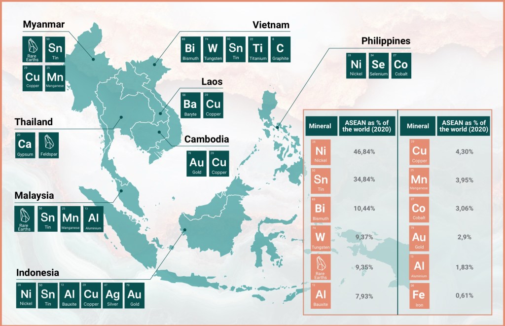 เอเชียตะวันออกเฉียงใต้เป็นส่วนหนึ่งของ “การตื่นแร่ที่มีความสำคัญมาก(Critical Minerals Rush)” ภูมิภาคนี้มีทรัพยากรแร่ที่มีความสำคัญมากจำนวนมาก แม้ว่าการกระจายตัวของแร่เหล่านี้จะแตกต่างกันอย่างมากในแต่ละประเทศ: