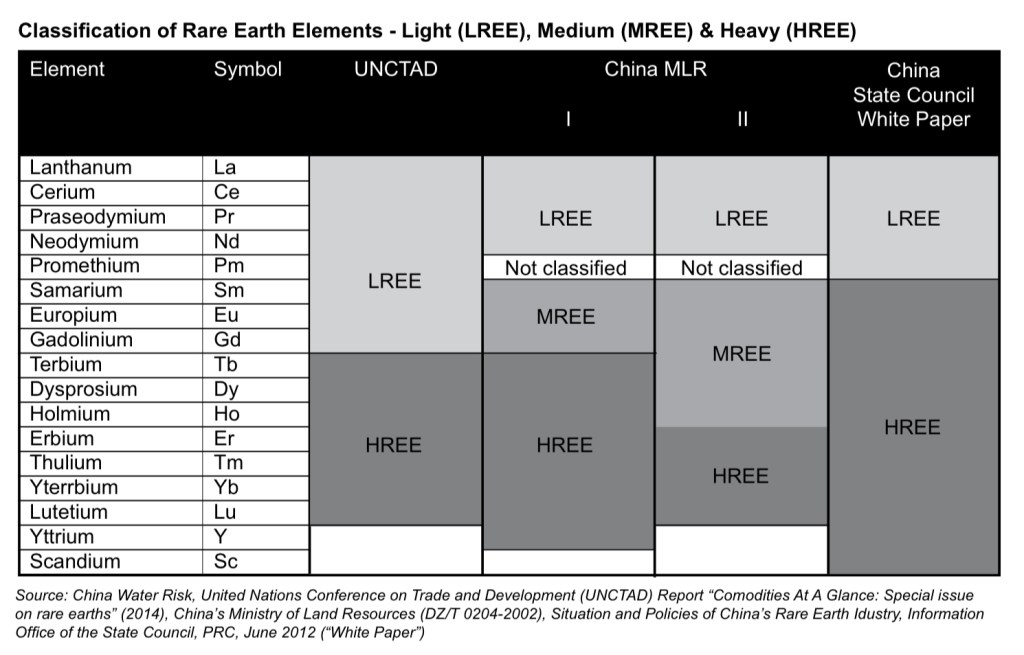 ในบางบริบท มีการจัดหมวดหมู่เพิ่มเติมคือ แรร์เอิร์ธระดับกลาง (Medium Rare Earth Elements – MREEs) ในประเทศจีน มักจัดกลุ่ม MREEs, HREEs และอิตเทรียมรวมกันว่า “แรร์เอิร์ธระดับกลางและหนัก (MHREEs)” อย่างไรก็ตาม ยังมีการจัดกลุ่มแตกต่างกันไปในหลายแหล่งข้อมูล ว่าองค์ประกอบใดเป็น LREE และองค์ประกอบใดเป็น MHREE ตารางด้านล่างแสดงการจัดจำแนกประเภทที่แตกต่างกันเหล่านี้ ข้อมูลที่ใช้ในรายงานฉบับนี้อ้างอิงจากหน่วยงานรัฐบาลหรือสถิติ เช่น ข้อมูลโควตาการผลิตจากกระทรวงที่ดินและทรัพยากร (MLR) ซึ่งได้แบ่งเป็น LREEs และ MHREEs แล้ว แม้จะไม่ได้ระบุชื่อธาตุแรร์เอิร์ธแต่ละตัวอย่างชัดเจน
