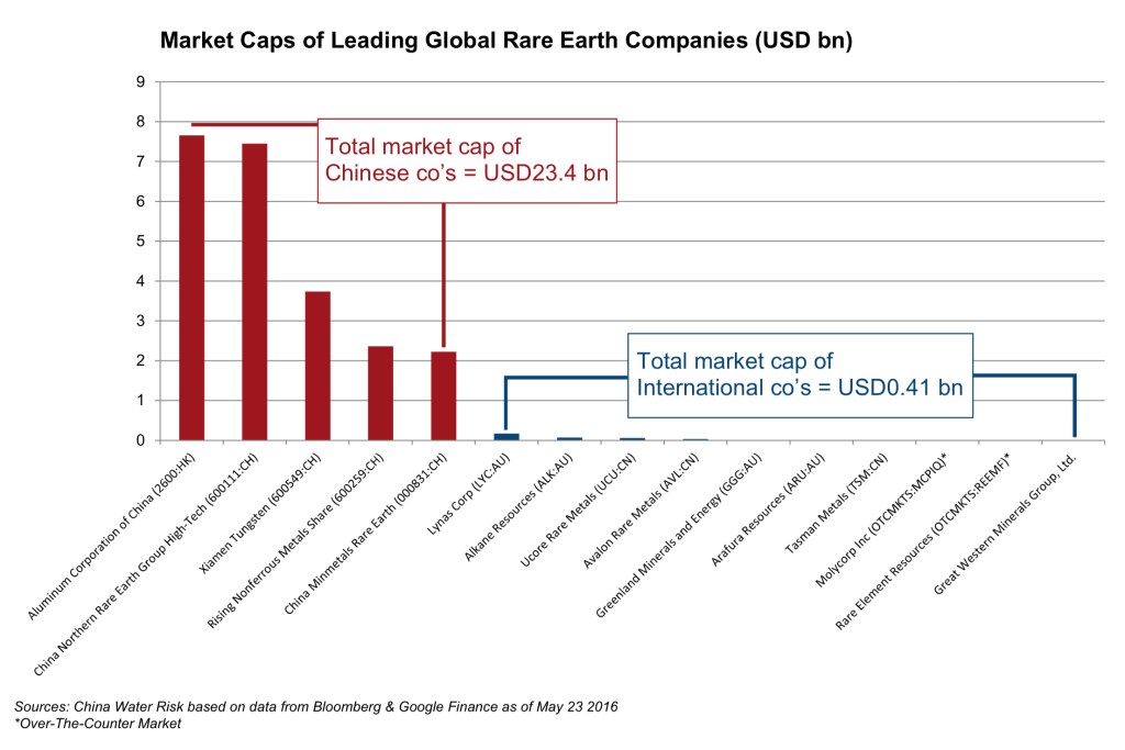 บริษัทแรร์เอิร์ธจีน 5 แห่งที่จดทะเบียนในตลาดหลักทรัพย์ครอบครองโควตาการผลิตแรร์เอิร์ธ 74% ในครึ่งแรกของปี 2559 แต่กลับมีมูลค่าตลาดรวมเพียง 154,000 ล้านหยวน (23.4 พันล้านดอลลาร์สหรัฐ) อย่างไรก็ตาม ในความเป็นจริง บริษัททั้งห้านี้ยังผลิตสินค้าอื่น ๆ ด้วย เช่น อะลูมิเนียม ทังสเตน และอื่น ๆ ดังนั้น มูลค่าตลาดที่แท้จริงของอุตสาหกรรมแรร์เอิร์ธของจีนอาจต่ำกว่าตัวเลขดังกล่าว