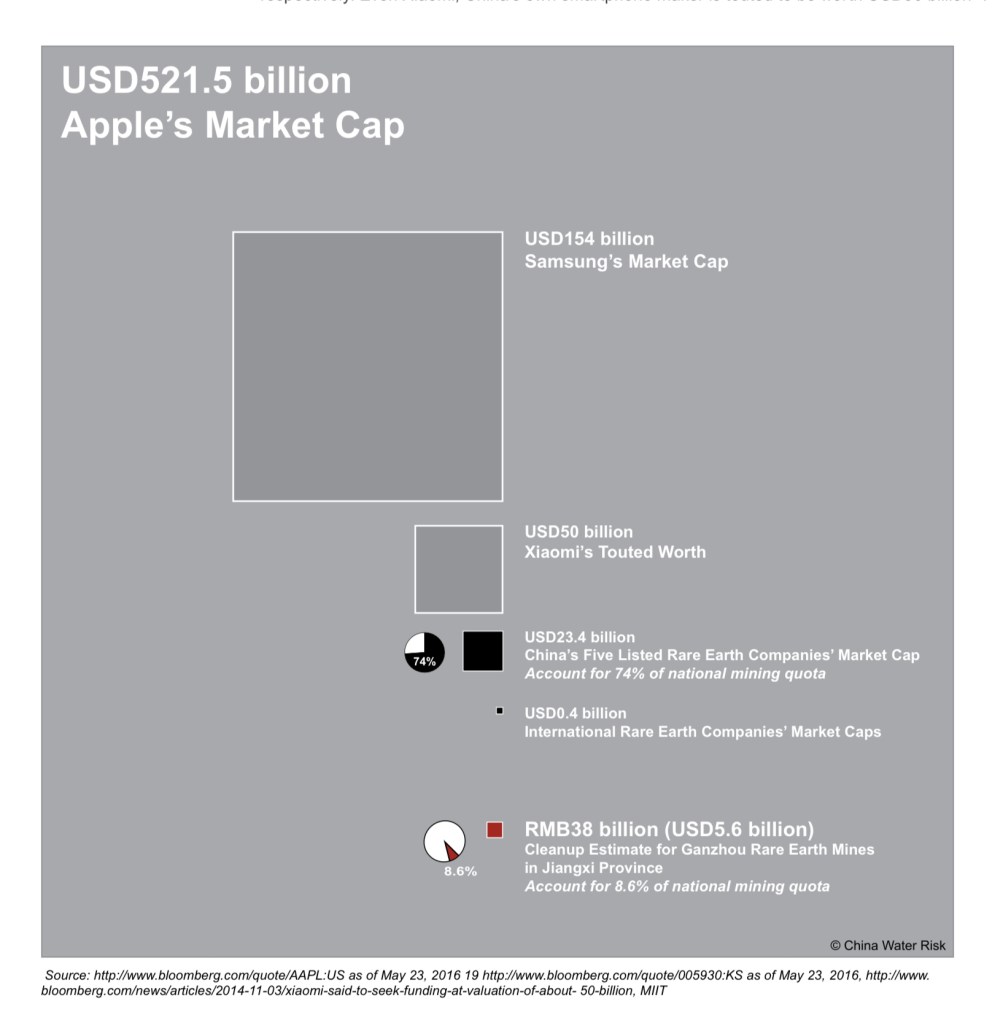เมื่อเปรียบเทียบแล้ว บริษัทที่ผลิตสมาร์ทโฟนและแท็บเล็ตอย่าง Apple และ Samsung ซึ่งต่างก็พึ่งพาแรร์เอิร์ธเหล่านี้ มีมูลค่าตลาดถึง 521.5 พันล้านดอลลาร์สหรัฐ และ 154 พันล้านดอลลาร์สหรัฐ ตามลำดับ แม้แต่ Xiaomi ผู้ผลิตสมาร์ทโฟนของจีนเอง ก็ถูกประเมินว่ามีมูลค่าสูงถึง 50 พันล้านดอลลาร์สหรัฐ
