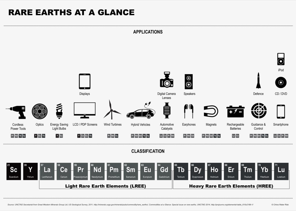 ผลิตภัณฑ์ส่วนใหญ่ของบริษัทเหล่านี้ ไม่สามารถทำงานได้หากไม่มีแรร์เอิร์ธ (REEs) — เช่น อิตเทรียม (Y), แลนทานัม (La), เทอร์เบียม (Tb), พราเซโอไดเมียม (Pr), ยูโรเพียม (Eu), ดิสโปรเซียม (Dy) และแกโดลิเนียม (Gd) ที่ทำให้หน้าจอมีความสว่างสดใส; นีโอไดเมียม (Nd), เทอร์เบียม (Tb) และดิสโปรเซียม (Dy) ที่ทำให้โทรศัพท์สั่นได้; พราเซโอไดเมียม (Pr), แกโดลิเนียม (Gd) และนีโอไดเมียม (Nd) ที่ทำให้ลำโพงและหูฟังมีน้ำหนักเบา เป็นต้น ที่น่ากังวลคือ การใช้งานแรร์เอิร์ธบางประเภท ยังไม่มีวัสดุทดแทน ในปัจจุบัน และหากมีวัสดุทดแทน ก็อาจทำให้ประสิทธิภาพลดลงหรือทำให้ต้นทุนสูงขึ้น