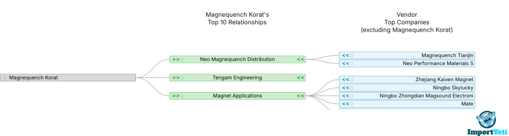 ข้อมูลจาก ImportYeti ชี้ให้เห็นความเชื่อมโยงระหว่างบริษัทแปรรูปแรร์เอิร์ทที่ใช้ทำแม่เหล็กถาวรที่ดำเนินการในประเทศไทยกับบริษัทต่างๆ ในห่วงโซ่อุปทานของแรร์เอิร์ธที่อยู่ปลายน้ำ ดังแผนผังด้านล่างนี้