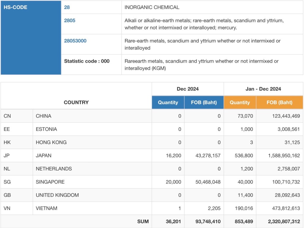 ระหว่างปี 2567 ที่ผ่านมา ไทยนำเข้าโลหะแรร์เอิร์ท สแคนเดียม และอิตเทรียม(พิกัด 28053000) มากที่สุดในปริมาณ 239 ตันจากมาเลเซีย โดยเฉพาะอย่างยิ่งจากบริษัท Lynas Malaysia Sdn. Bhd. (ซึ่งเป็นบริษัทลูกของ Lynas ในออสเตรเลีย หนึ่งในผู้เล่นคนสำคัญของอุตสาหกรรมแรร์เอิร์ธนอกประเทศจีน) รองลงมาเป็นการนำเข้ามาจากประเทศจีนในปริมาณ 48.5 ตัน