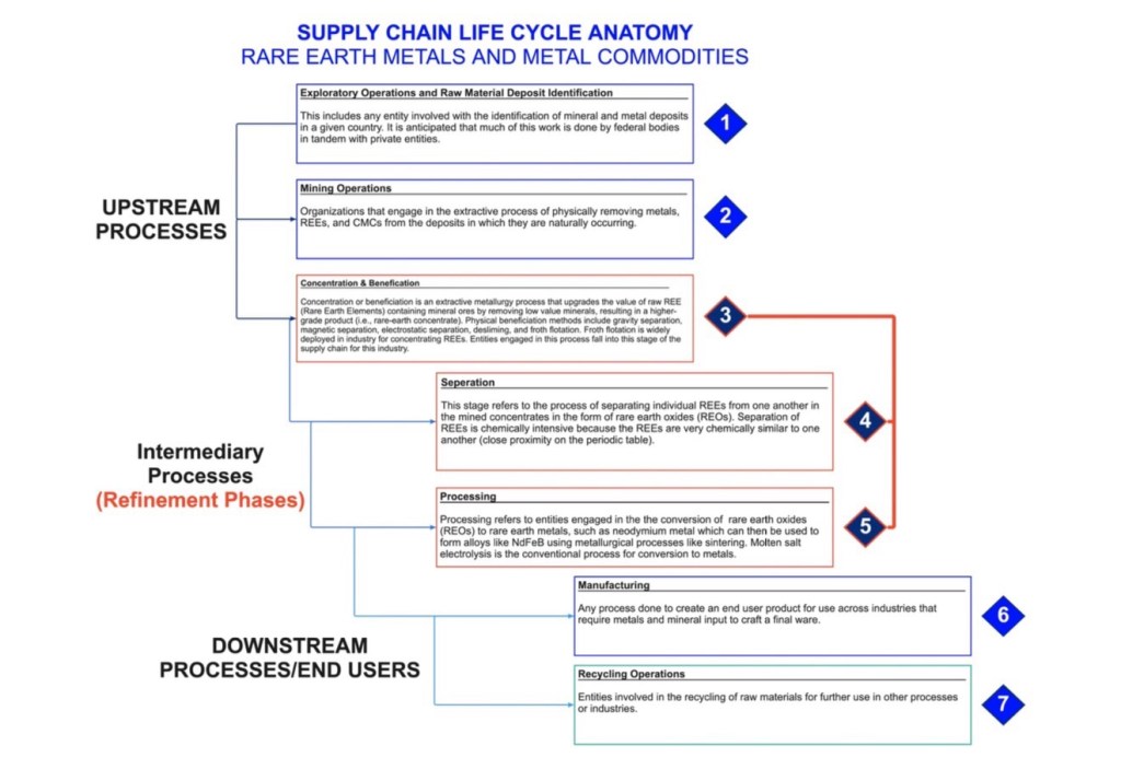 วงจรชีวิตของวัตถุดิบแร่แรร์เอิร์ธ (ดูรูป) สามารถแบ่งออกได้อย่างมีประสิทธิภาพเป็น 7 ขั้นตอนหลัก ได้แก่