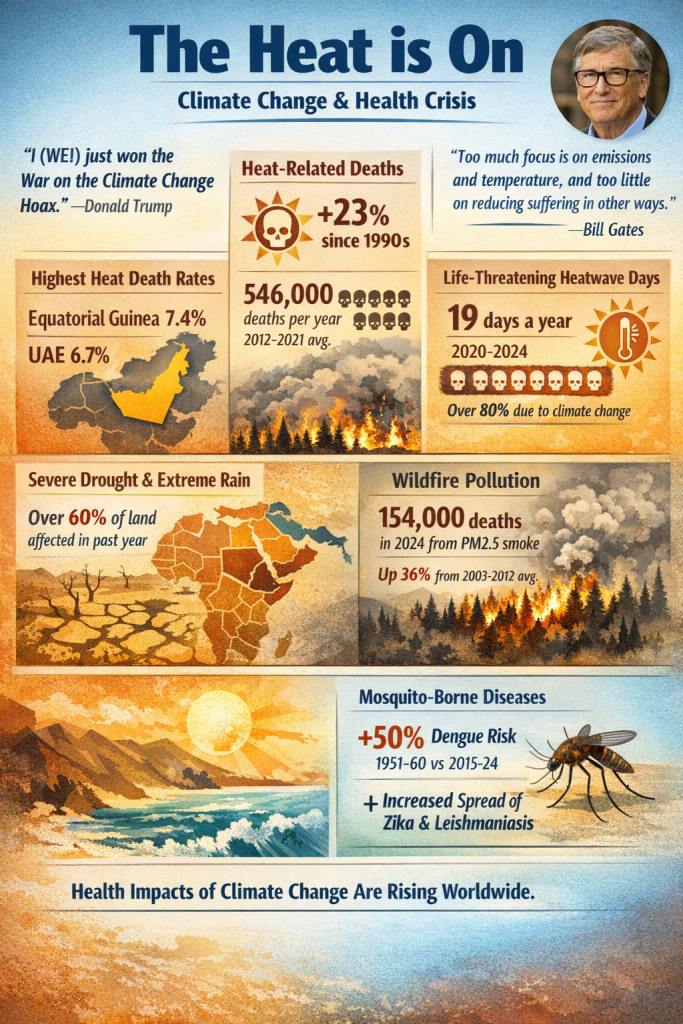อย่างไรก็ตาม ก็ชัดเจนมากขึ้นเรื่อย ๆ ว่าปัญหาเรื่องสภาพภูมิอากาศกับสุขภาพนั้นพัวพันกันอย่างใกล้ชิด ตั้งแต่ปี 2016 รายงานประจำปี Lancet Countdown ซึ่งจัดทำโดยกลุ่มสถาบันวิชาการด้านการแพทย์นานาชาติ องค์การอนามัยโลก (WHO) และหน่วยงานอื่น ๆ ของสหประชาชาติ ได้ประเมินงานวิจัยทางวิทยาศาสตร์เกี่ยวกับความสัมพันธ์ดังกล่าว รายงานปีนี้ที่เผยแพร่เมื่อวันที่ 29 ตุลาคม มีสถิติที่ชวนตกใจหลายอย่าง เช่น พบว่าอัตราการเสียชีวิตที่เกี่ยวข้องกับความร้อนเพิ่มขึ้น 23% ระหว่างทศวรรษ 1990s กับ 2010s แม้จะปรับคำนึงถึงการเพิ่มของประชากรแล้วก็ตาม ผู้เขียนประเมินว่าในช่วงปี 2012–2021 ความร้อนคร่าชีวิตผู้คนเฉลี่ยปีละ 546,000 คน ซึ่งใกล้เคียงกับจำนวนผู้เสียชีวิตจากมาลาเรีย และระหว่างปี 2020–2024 ผู้คนทั่วโลกต้องเผชิญกับ “วันคลื่นความร้อนที่คุกคามชีวิต” เฉลี่ยปีละ 19 วัน โดยมากกว่า 80% ของวันเหล่านั้น “คงไม่เกิดขึ้น” หากไม่มีการเปลี่ยนแปลงสภาพภูมิอากาศ