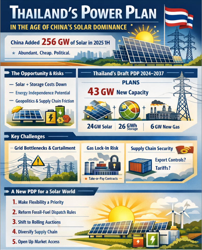 China’s solar dominance gives Thailand an opening: decarbonize faster, cut exposure to LNG volatility, and strengthen energy affordability. But it also removes excuses. If solar is cheap and plentiful—and the transition still stalls—then the barrier is not technology. It is governance.