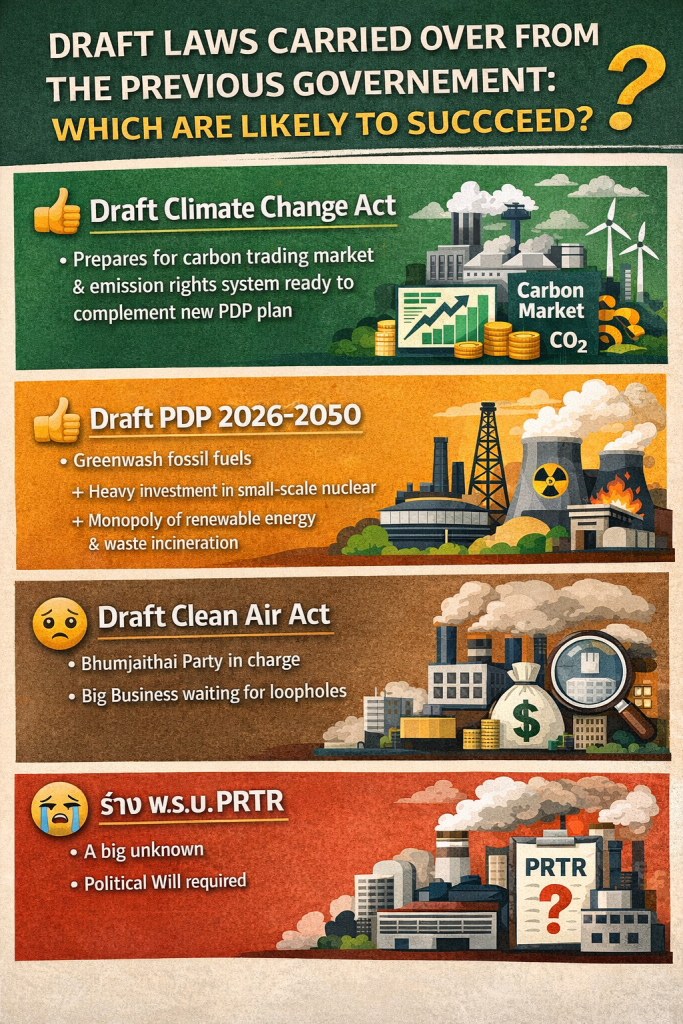 (ร่าง) แผนพัฒนากำลังผลิตไฟฟ้า (PDP2026-2050) ที่ออกแบบมาเพื่อให้เอื้อต่ออุตสาหกรรมฟอสซิลได้ฟอกเขียวตัวเองแบบหมดจด ไม่ว่าจะเป็นการใช้ไฮโดรเจนและแอมโมเนียมาผสมกับก๊าซฟอสซิล การดักจับและกักเก็บคาร์บอน และโรงไฟฟ้านิวเคลียร์ขนาดเล็ก รวมถึงเขื่อนในประเทศเพื่อนบ้านแบบหนักมาก ที่น่าสนใจกว่าคือการครอบงำระบบพลังงานหมุนเวียนแบบกินรวบไว้คนเดียว รวมถึงเทคโนโลยีสกปรกอย่างโรงงานเผาขยะ ล้อไปกับ (ร่าง) กฏหมายโลกร้อนที่เน้นการบริหารจัดการคาร์บอน