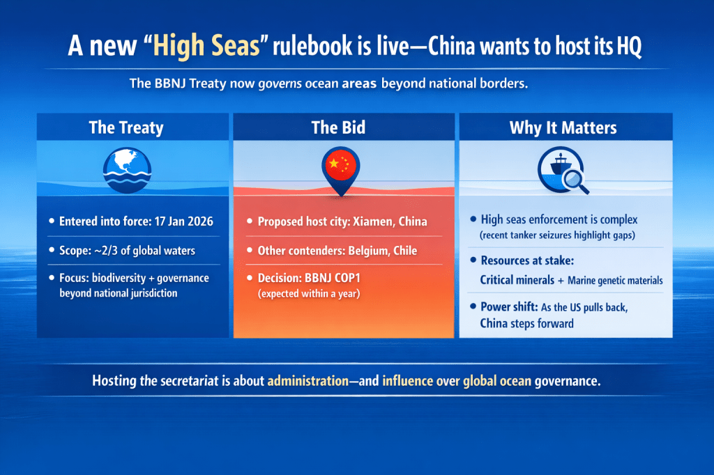 จีนเสนอเป็นเจ้าภาพ “สำนักเลขาธิการ” ของสนธิสัญญาฉบับใหม่ที่กำกับดูแลทะเลหลวง (high seas) ซึ่งผู้สังเกตการณ์มองว่าเป็นความพยายามล่าสุดของปักกิ่งในการก้าวเข้ามามีบทบาทเชิงรุกมากขึ้นในการกำหนดกติกาและระเบียบระหว่างประเทศ