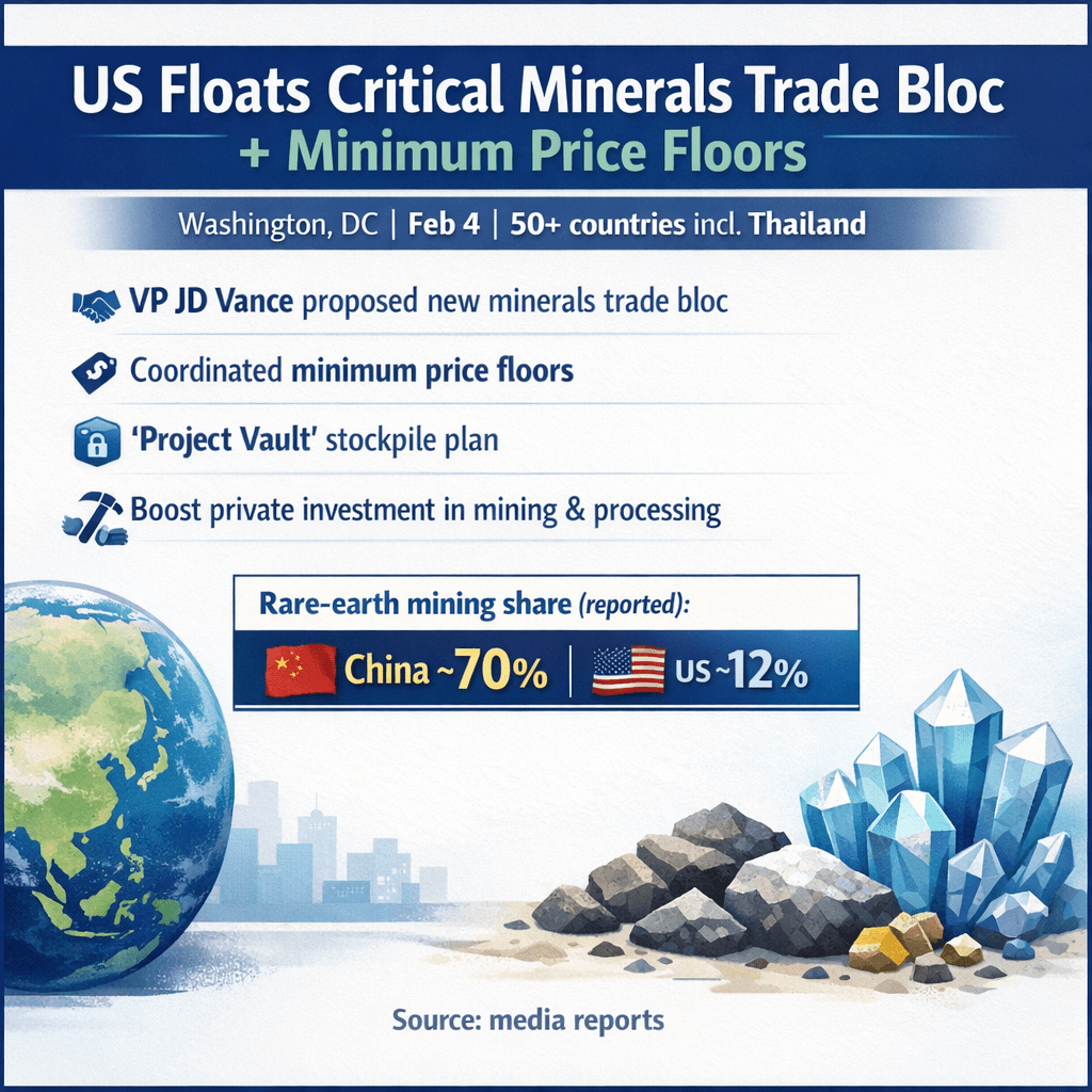 สหรัฐฯ เป็นเจ้าภาพจัดการประชุมที่กรุงวอชิงตันร่วมกับมากกว่า 50 ประเทศ รวมถึงไทย หลังรองประธานาธิบดี เจ.ดี. แวนซ์ เสนอแนวคิด “กลุ่มการค้าแร่ธาตุสำคัญ” (critical minerals trade bloc) แบบใหม่ และการกำหนด “ราคาขั้นต่ำ” (minimum price floors) เพื่อมุ่งลดการพึ่งพาจีน