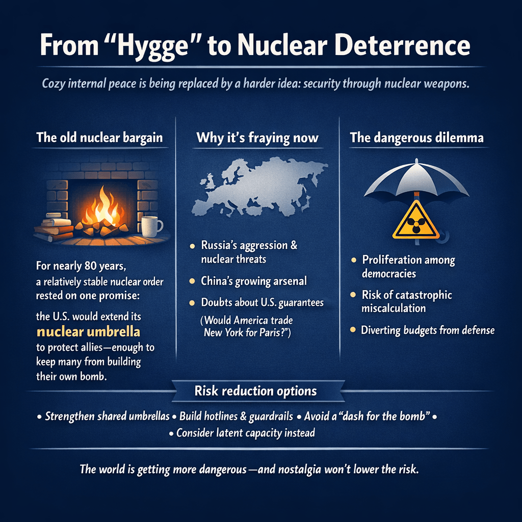 คำว่า hygge ในภาษาเดนมาร์กสื่อถึงความผ่อนคลายแบบอบอุ่นสบาย ๆ ที่มักมาจากเตาผิง ถุงเท้าขนสัตว์ และช็อกโกแลตร้อน แต่ทุกวันนี้ นักยุทธศาสตร์กลาโหมบางส่วนในภูมิภาคนอร์ดิกมองว่าสันติภายในอาจได้มาจากอาวุธนิวเคลียร์เท่านั้น พันธมิตรของอเมริกาอย่างโปแลนด์ ญี่ปุ่น และเกาหลีใต้ ก็เริ่มพิจารณาเช่นกันว่าพวกเขาจำเป็นต้องมีอาวุธของตัวเองหรือไม่