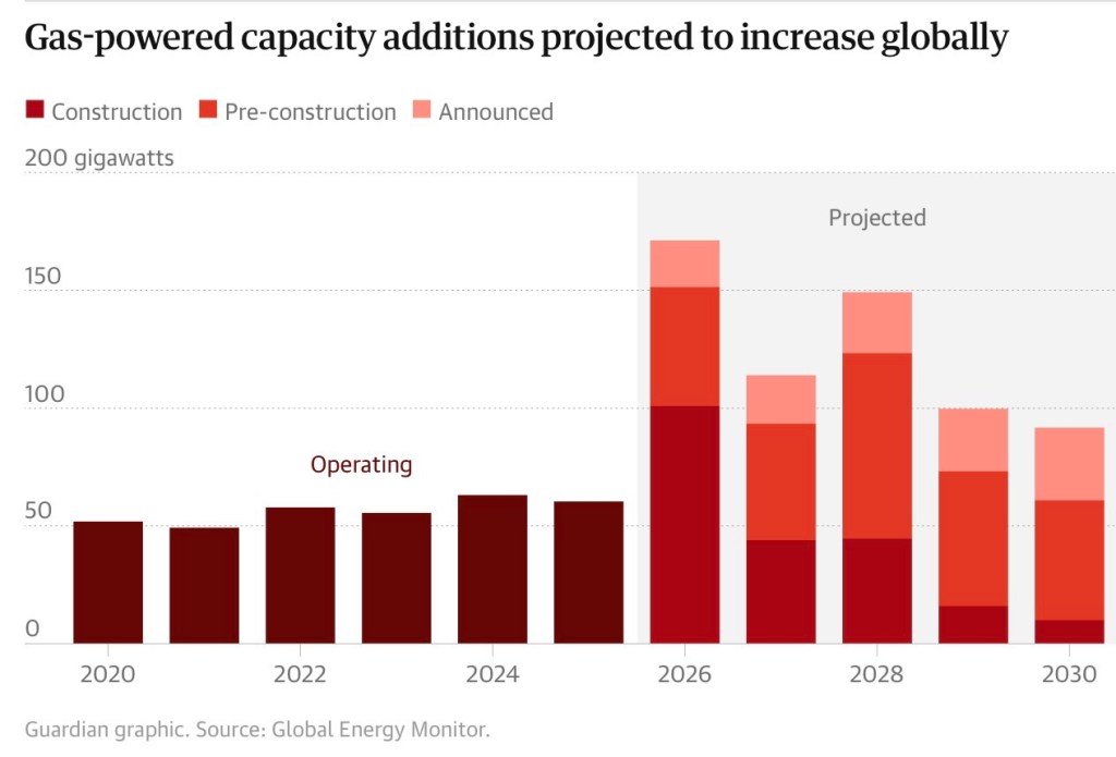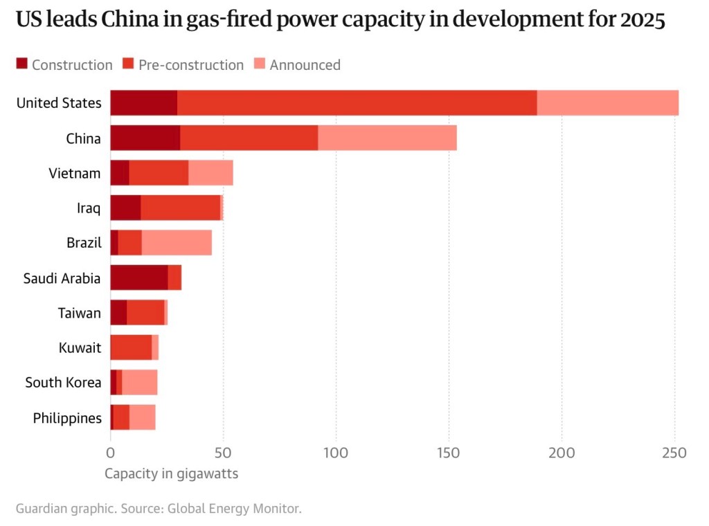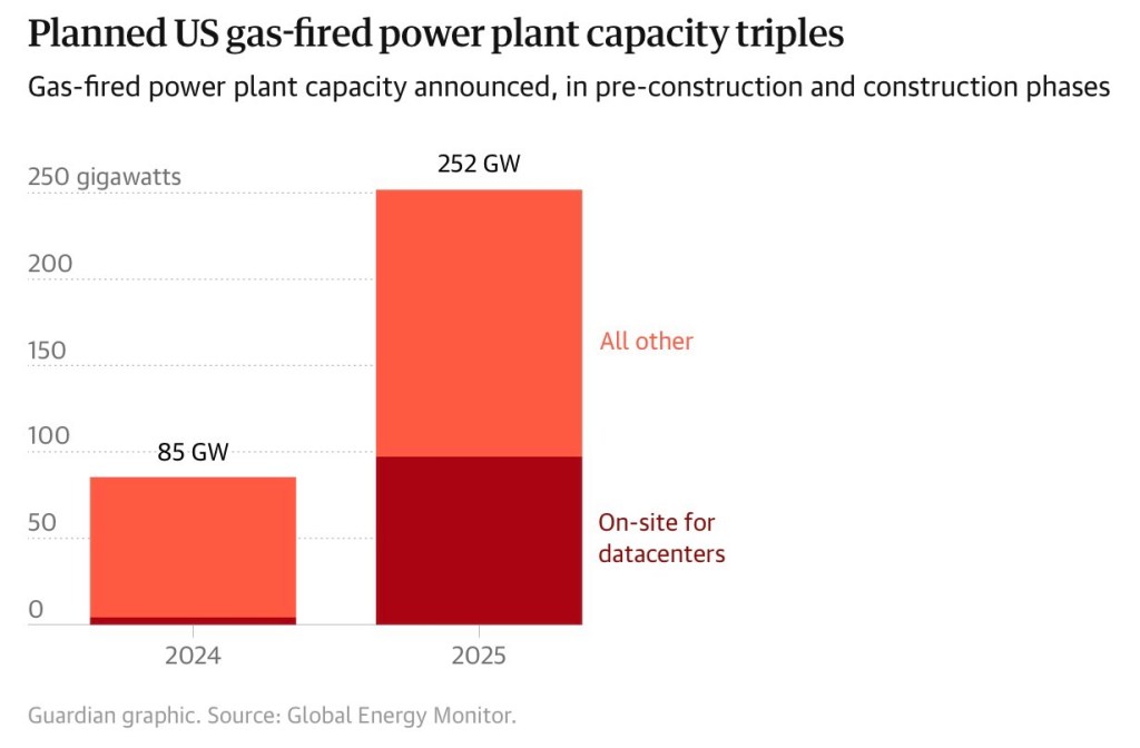 สหรัฐฯ อยู่แถวหน้าของแรงผลักระดับโลกที่หันไปพึ่งก๊าซ ซึ่งมีแนวโน้มจะยิ่งทวีความรุนแรงในช่วงห้าปีข้างหน้า หลังจากสหรัฐฯ เพิ่มกำลังผลิตไฟฟ้าจากก๊าซ “ตามแผน” ของตนขึ้นเป็นสามเท่าในปี 2025 กำลังผลิตใหม่จำนวนมากจะถูกใช้เพื่อรองรับความต้องการไฟฟ้ามหาศาลของ AI โดยหนึ่งในสามของกำลังผลิตไฟฟ้าจากก๊าซที่อยู่ระหว่างพัฒนาทั้งหมด 252 กิกะวัตต์ ถูกคาดว่าจะตั้งอยู่ “ในพื้นที่เดียวกัน” กับศูนย์ข้อมูล