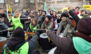 “Let’s stick with them so we don’t get lost,” I told Topsi, a former Greenpeace action coordinator from Thailand who is now studying for her master’s degree in Germany and has come over here to represent the University of Freiburg at COP15. When we arrive at the Drum group, I begin jumping up and down with the others.